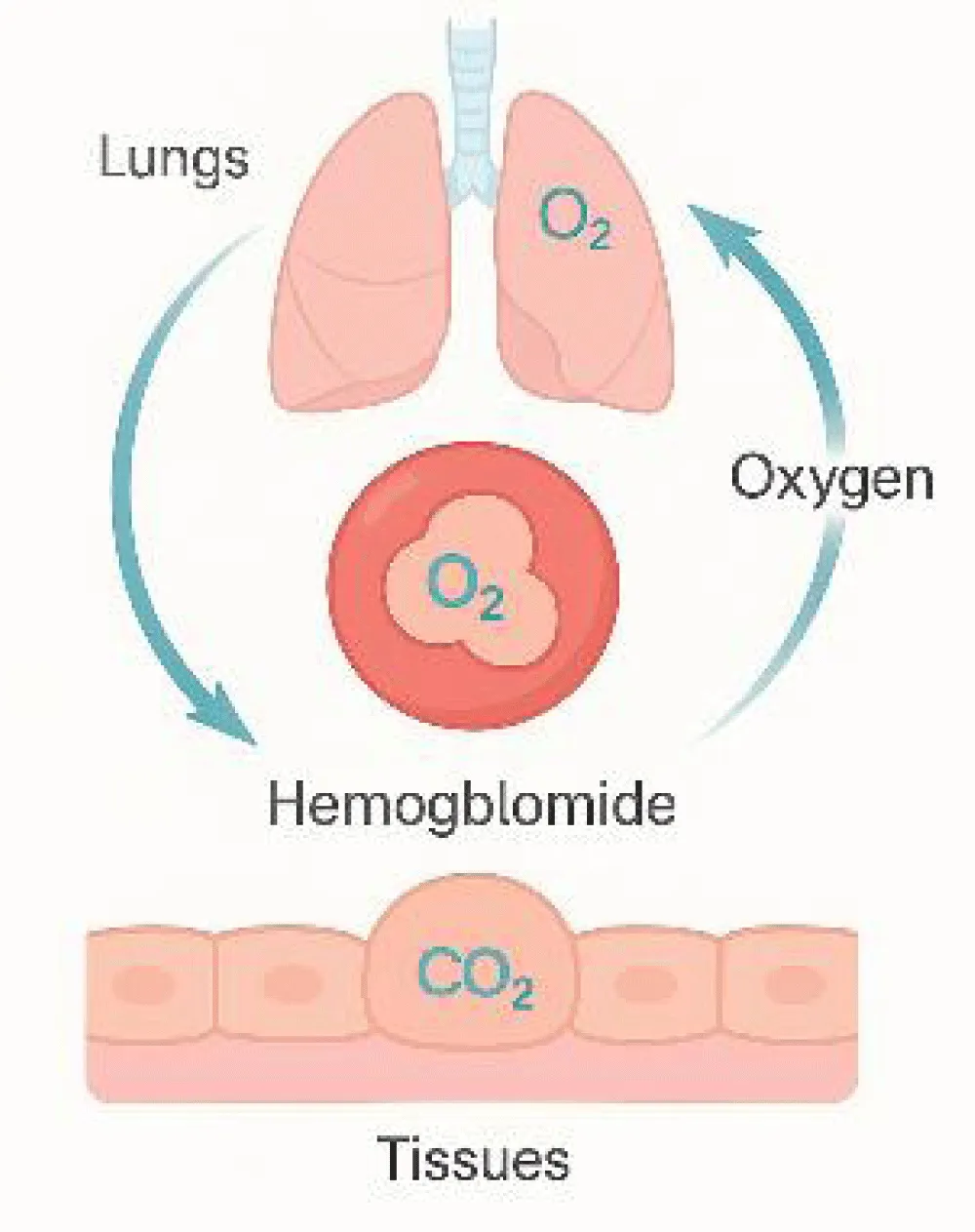 (Figure 3) Mechanism of oxygen transport and gas exchange through hemoglobin. Hemoglobin binds oxygen in the lungs and releases it in tissues while carrying carbon dioxide back to the lungs. This reversible exchange maintains efficient gas transport and blood pH balance. Over the past two decades, research has revealed that hemoglobin synthesis depends not only on iron availability but also on a complex network of vitamins, minerals, and enzymes that regulate iron absorption, heme formation, and erythrocyte maturation.
