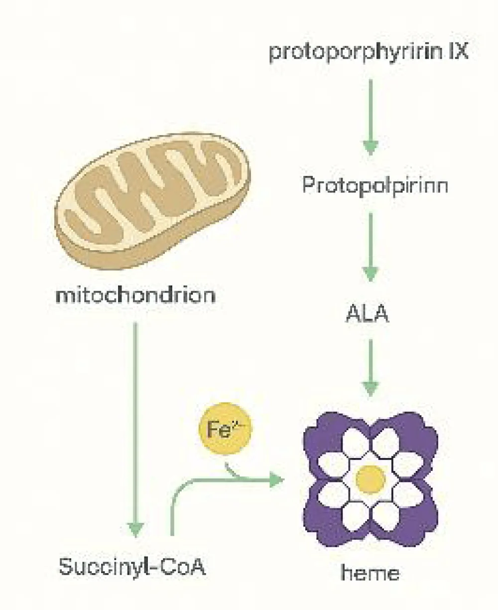 Figure 4, Heme biosynthesis begins in the mitochondria, where glycine reacts with succinyl-CoA via ALA synthase, producing 5-aminolevulinic acid (ALA). This reaction is the initial and rate-limiting step in heme formation, which later contributes to hemoglobin production.