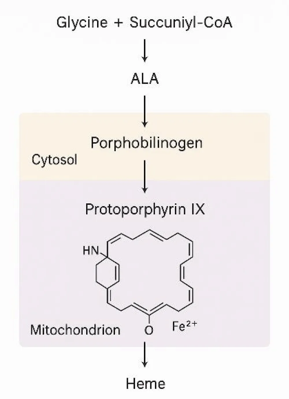 Figure 5, schematic representation of the heme biosynthetic pathway illustrating the sequential cytosolic and mitochondrial enzymatic reactions that transform metabolic precursors into porphyrin intermediates, ultimately forming protoporphyrin IX and culminating in the insertion of Fe²⁺ by ferrochelatase to produce heme.