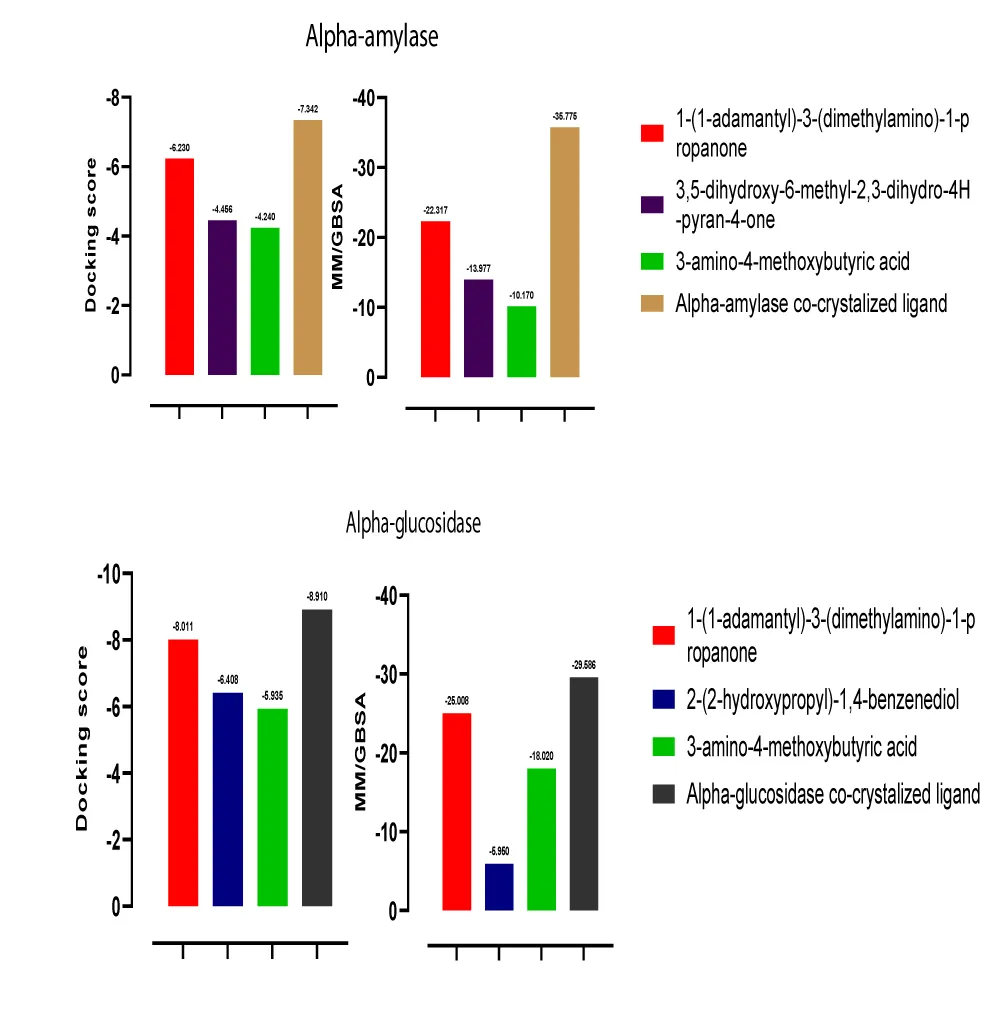 The molecular docking result showed that 1-(1-adamantyl)-3-(dimethylamino)-1-propanone, 3,5-dihydroxy-6-methyl-2,3-dihydro-4H-pyran-4-one, and 3-amino-4-methoxybutyric acid are potential inhibitors of alpha-amylase with their docking scores close to that of alpha-amylase co-crystalized ligand. The docking scores of the hit compounds compared with the co-crystalized ligand are; -6.230, -4.456, -4.240, and -7.342 respectively (Figures 7 and 8). In the same vein, 1-(1-adamantyl)-3-(dimethylamino)-1-propanone, 2-(2-hydroxypropyl)-1,4-benzenediol, and 3-amino-4-methoxybutyric acid are predicted potential inhibitors of alpha-glucosidase with docking scores close to the co-crystallized ligand docking score. The docking scores of these compounds compared with the co-crystallized ligand docking score are; -8.011, -6.408, -5.935, and – 8.910 respectively. The differences in the docking scores were pictorially represented in Figure 9.