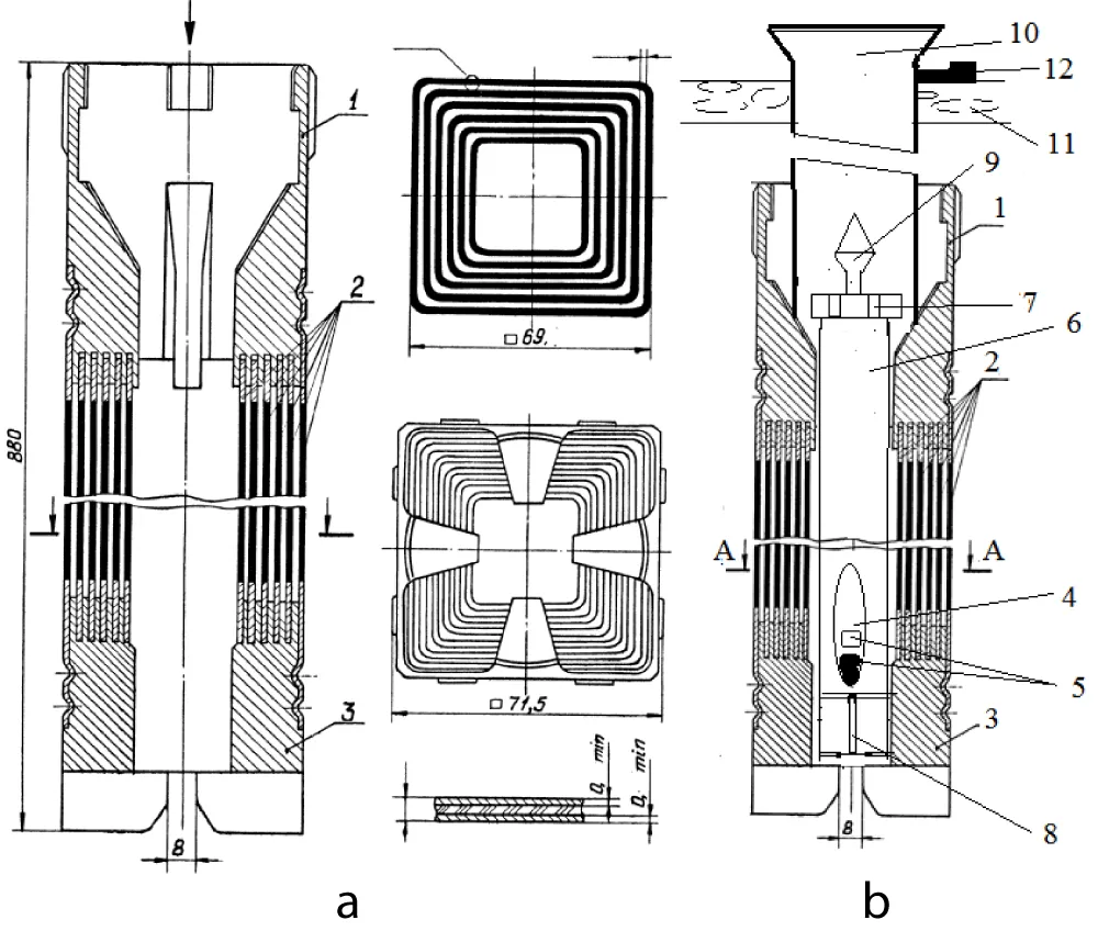 Figure 3 shows a 6-tube fuel assembly IRT-4M (a) and a special aluminum block container with irradiation target and design for fastening the irradiation channel to the reactor platform (b).