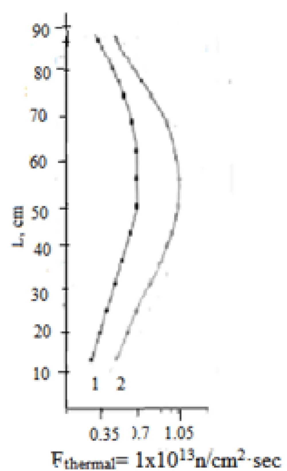Figure 4 shows the distribution of the thermal neutron flux density in the vertical irradiation channel of the WWR-SM reactor, determined by the TND method.