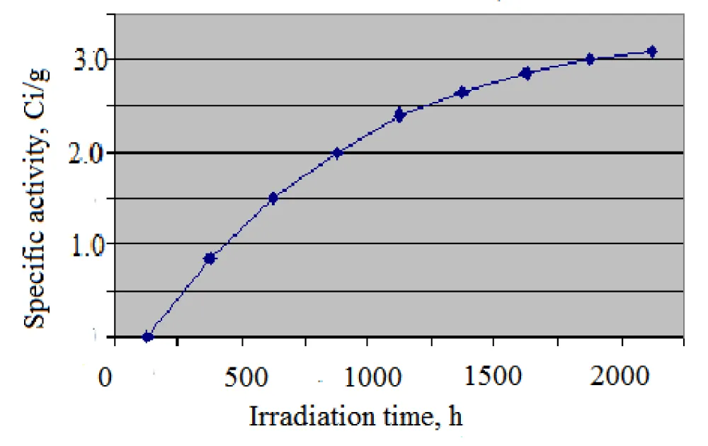 Thus, by irradiating the target in the center of the active zone, or closer to the beryllium reflector, or inside the fuel assembly in a special container in the middle of the vertical channel, and with an irradiation time of up to 2000 hours at a reactor power of 10 MV, it is possible to achieve a high specific activity of the target sulfur-35 radionuclide.