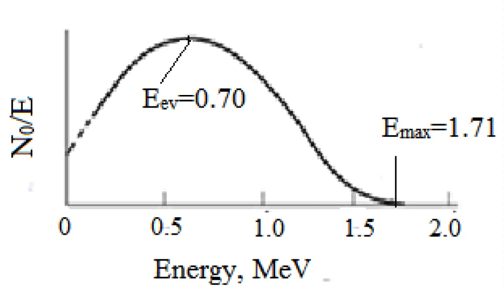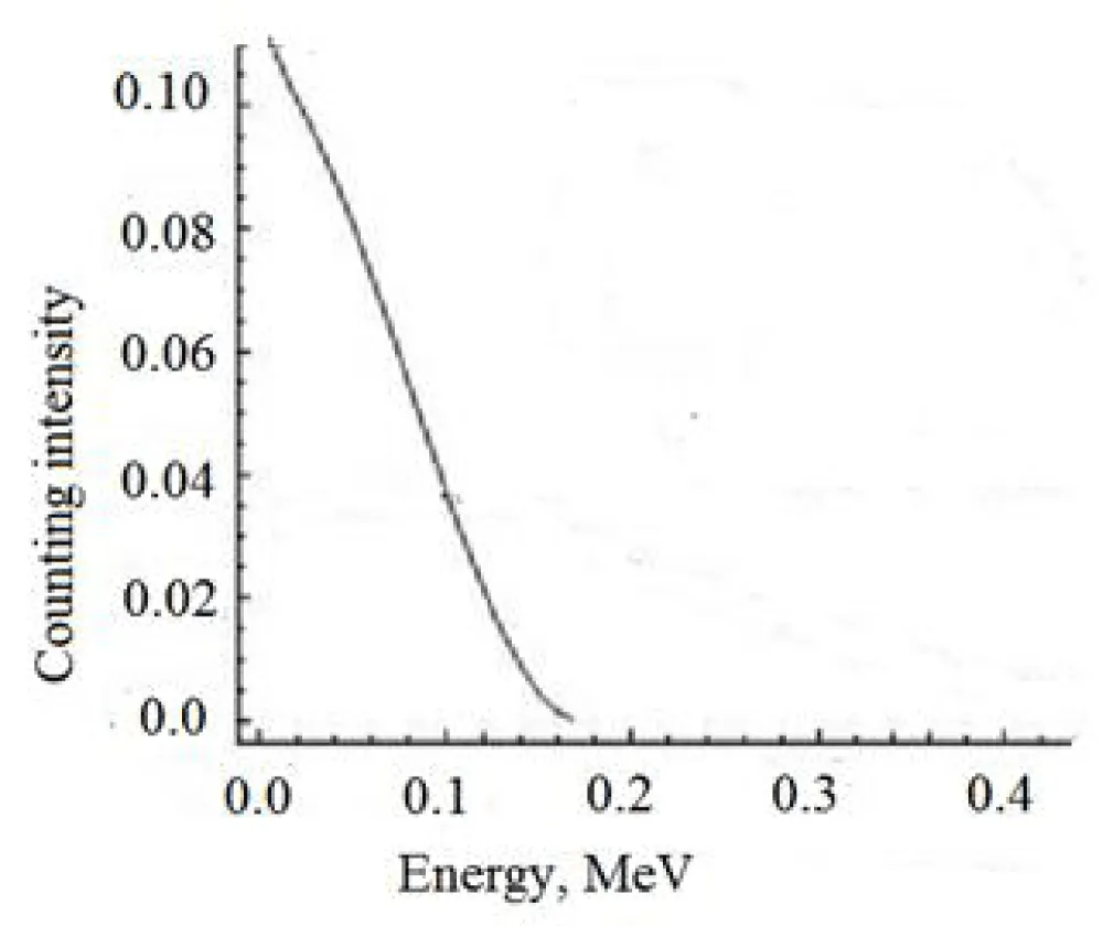 From the energy spectrum of beta radiation of the radionuclide 35S (Figure 6), it is clear that it has a maximum energy of Eβ = 0.167 MeV, which is more than 10 times less than the energy spectrum of the radionuclide P-32 with a maximum energy of 1.71 MeV (Figure 7).